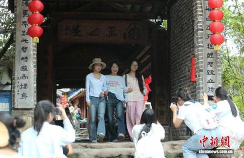 圖為中外青年在那柯裡茶馬古道驛站石板路上開心合影。黃興鴻 攝